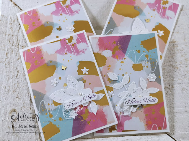 Und im Hintergrund ein schönes Designerpapier. Hier ist es das Besondere Designerpapier Abstrakte Schönheit aus dem Frühjahreskatalog.